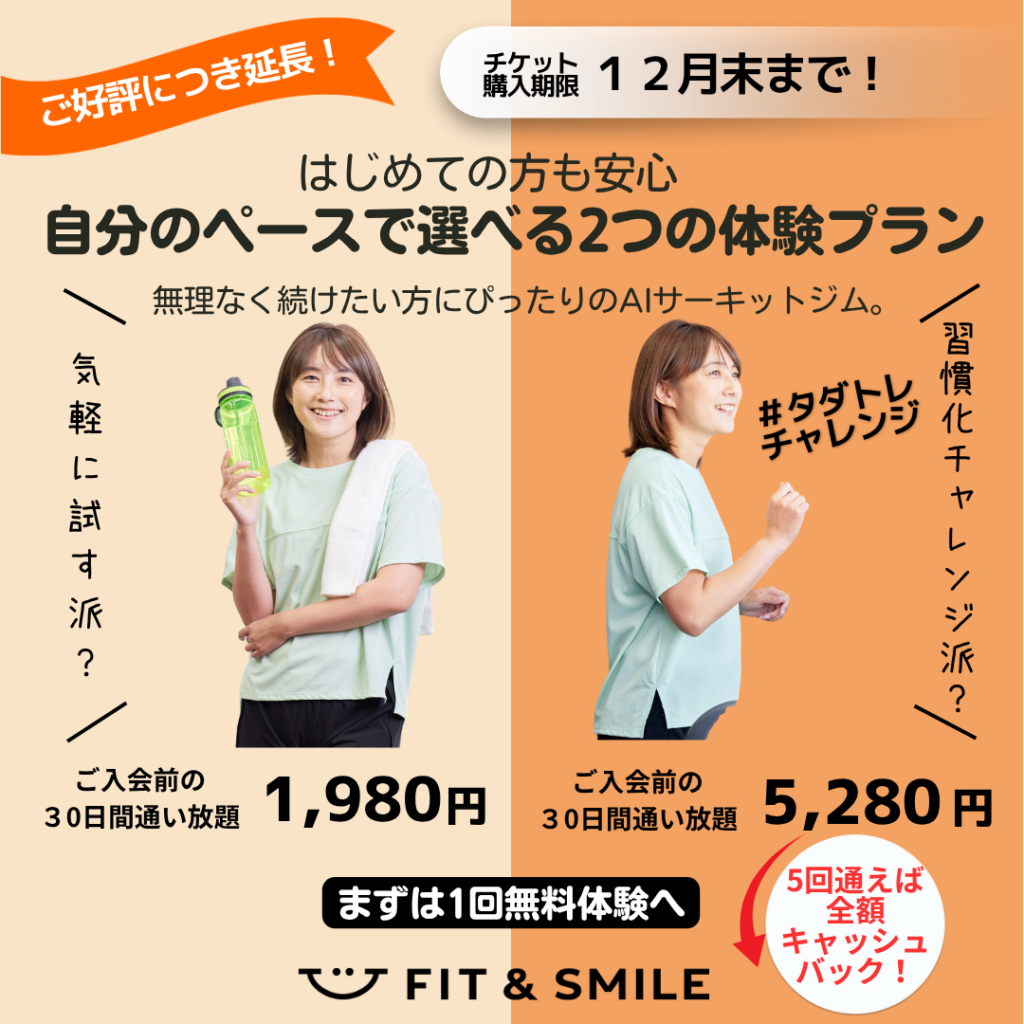 FIT&SMILEの「30日間通い放題」特別バージョンが、ご好評につき12月末までお申し込み可能となりました。