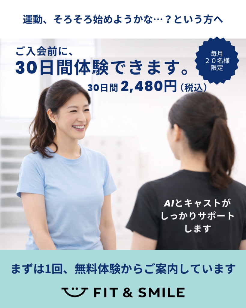FIT&SMILEでは、いきなり入会するのではなく、30日間しっかり通ってから、「自分に合っているか」「無理なく続けられそうか」を確かめていただける体験プランをご用意しています。