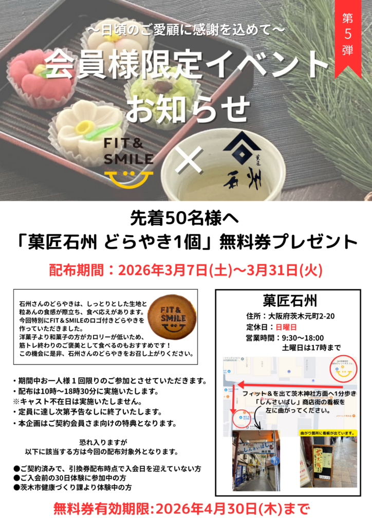 【会員さま限定イベント第5弾】菓匠 石州 × FIT&SMILE 先着50名様へロゴ入りどらやき1個無料券プレゼント