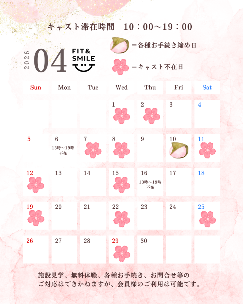 4月のキャスト不在日時および各種お手続き締切日について、下記の通りご案内申し上げます。